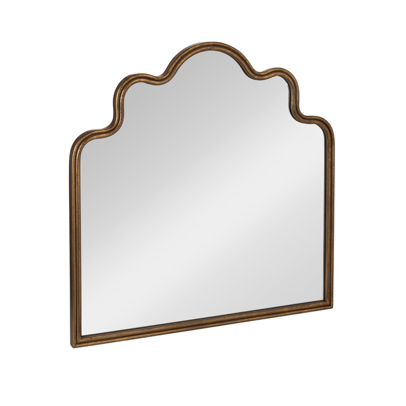 This distressed gold arched wall mirror is a unique and beautiful accessory for the home or office. Its gold metal frame features a wavy scalloped edge, adding texture and dimension to your space. The arched shape is graceful and sophisticated, while the w
