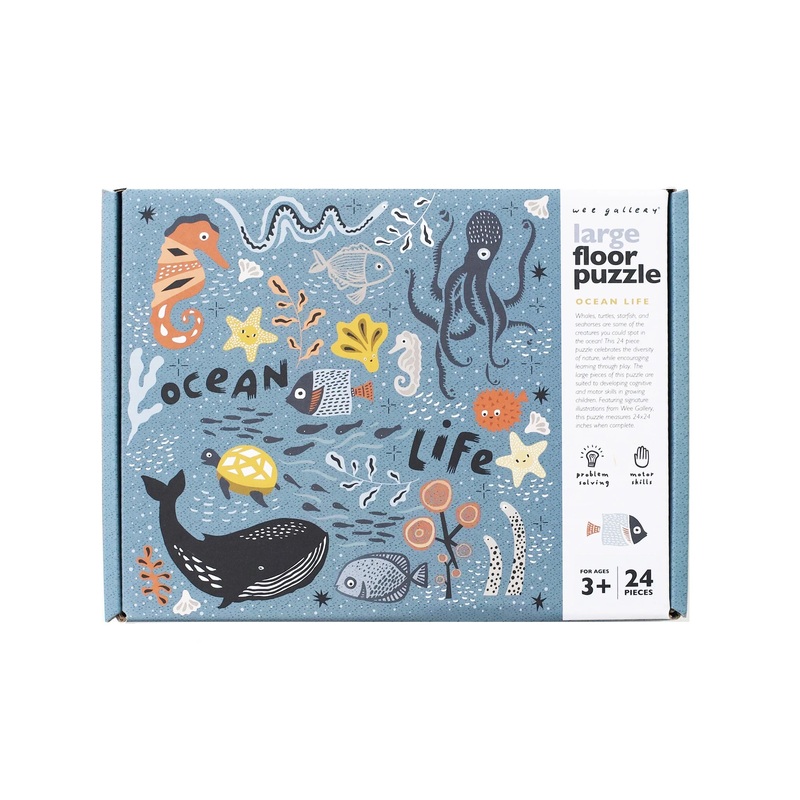 Wee Gallery's 24 piece Ocean Life floor puzzle celebrates the diversity of nature while encouraging learning through play! With signature illustrations to help support motor skill development and sensory stimulation for children 3+. The large pieces are su