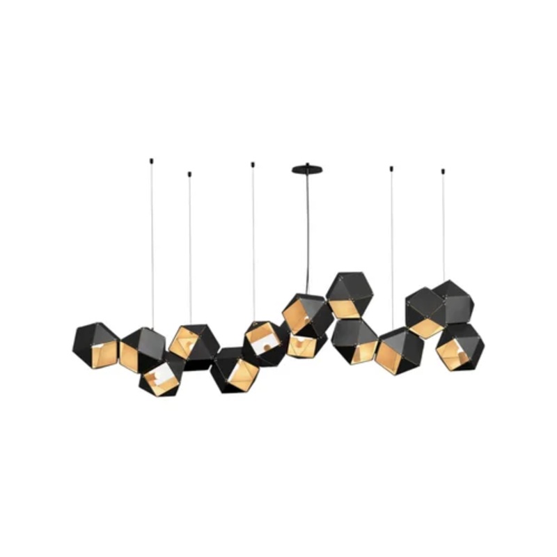 The Welles Steel Long Chandelier 14 really stands out in modern style, loved just as much as its close version, the Welles 12 Chandelier. It’s bigger and its modular beauty makes it work for different rooms, like dining tables, living spaces or entranceways. This light fixture mixes well with both simple and fancy styles, balancing well between use and beauty.