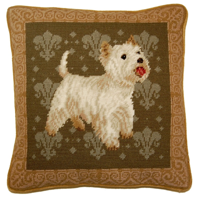 Accessorize your sofa, bed or accent chair with the Westie Dog Needlepoint Pillow from HKH International, a production, import and wholesale company that uses the finest vegetable-dyed Australian and New Zealand wool threads for needlepoint designs. Handma