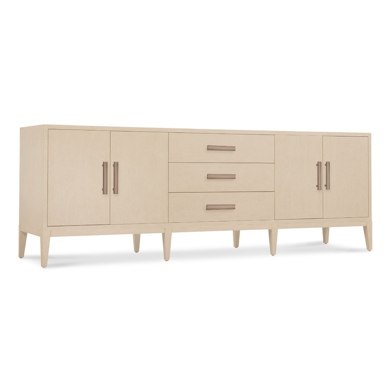 The Westwood Credenza combines sleek modern design with subtle sophistication, making it perfect for living rooms or entertainment spaces. Finished in Polished Limestone over quartered oak veneers, it exudes a soft modern appeal. Featuring four doors with one adjustable shelf behind each pair, three center drawers, and a ventilated back panel with wire management cutouts, this credenza is ideal for holding entertainment systems or providing extra storage. The custom plated Radiance finish hardware and tapered legs complete the look of this elegant yet functional piece.