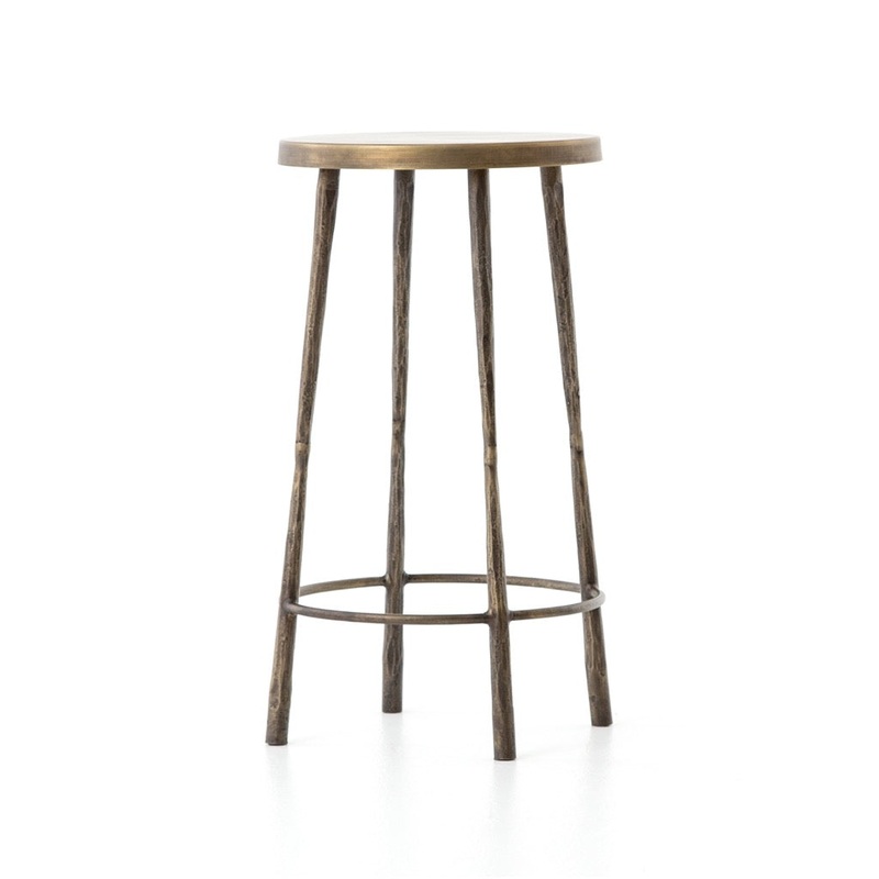 Primitive inspiration leads to a hand-crafted look. Antique brass iron is hand-wrought for rich, rough texture that offsets stool's slender form. Perfect paired or in multiples.