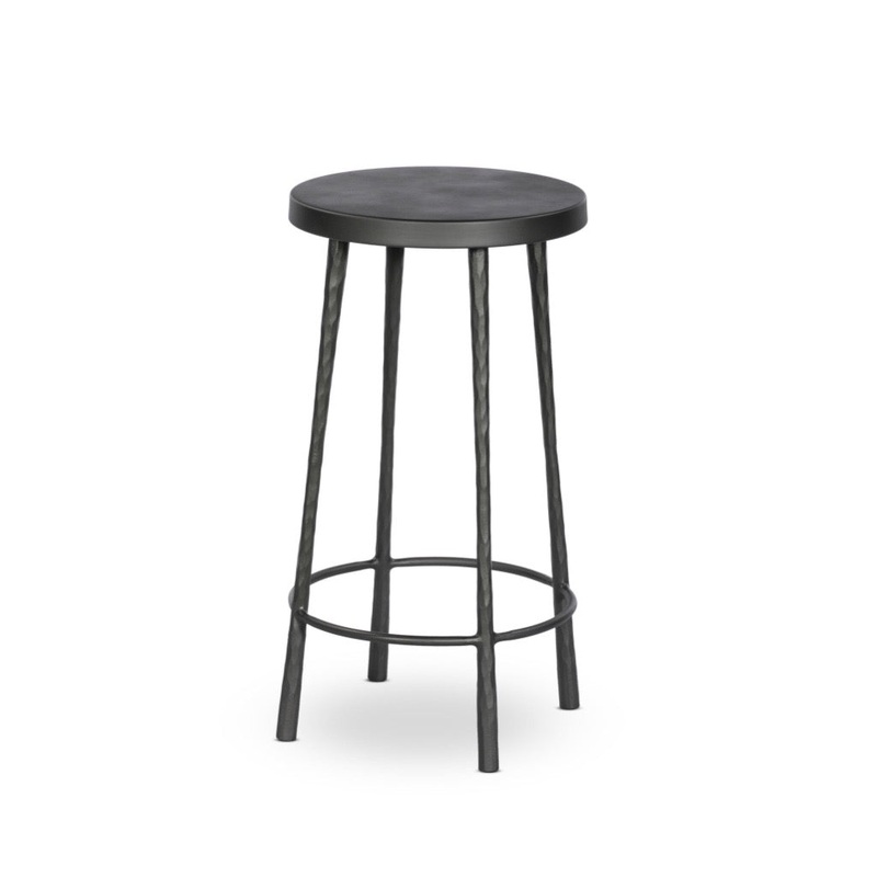 Primitive inspiration leads to a hand-crafted look. Gunmetal-finished iron is hammered and hand-wrought for rich, rough texture that offsets this stool’s slender form. Perfect paired or in multiples.