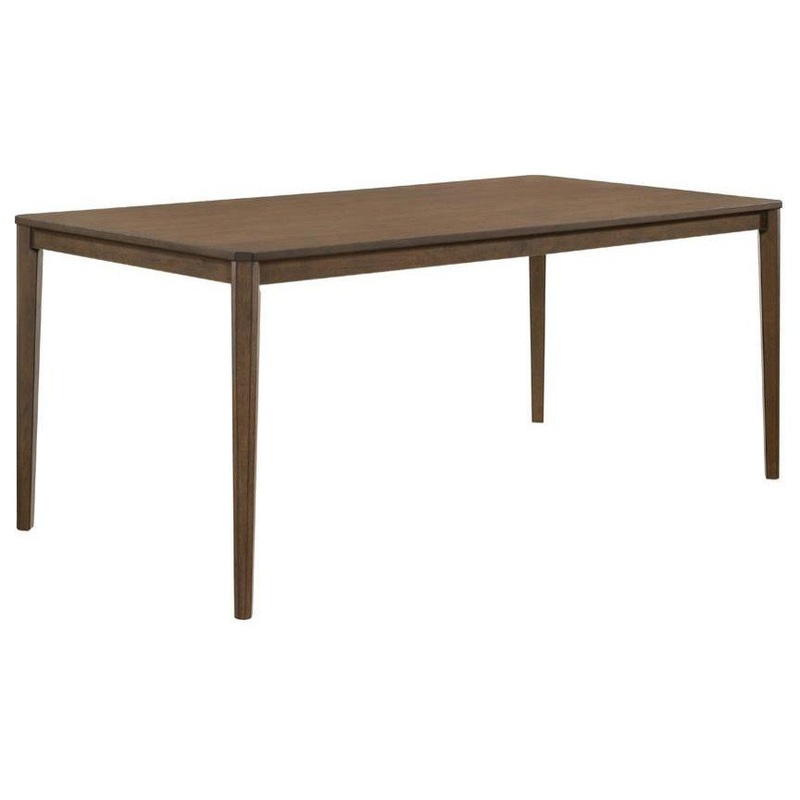 A sleek silhouette makes this wooden dining table a perfect choice for anyone who prefers a minimalist decor style. Slim, tapered legs support an expansive, rectangular tabletop to create a design that exudes simple glamour. A lightly beveled top with clipped corners adds just the right touch of understated style. A rich, medium walnut finish allows this beautiful piece to warm up a room. Crafted of Asian hardwood, this transitional dining table is exceptionally durable and built for lasting use.