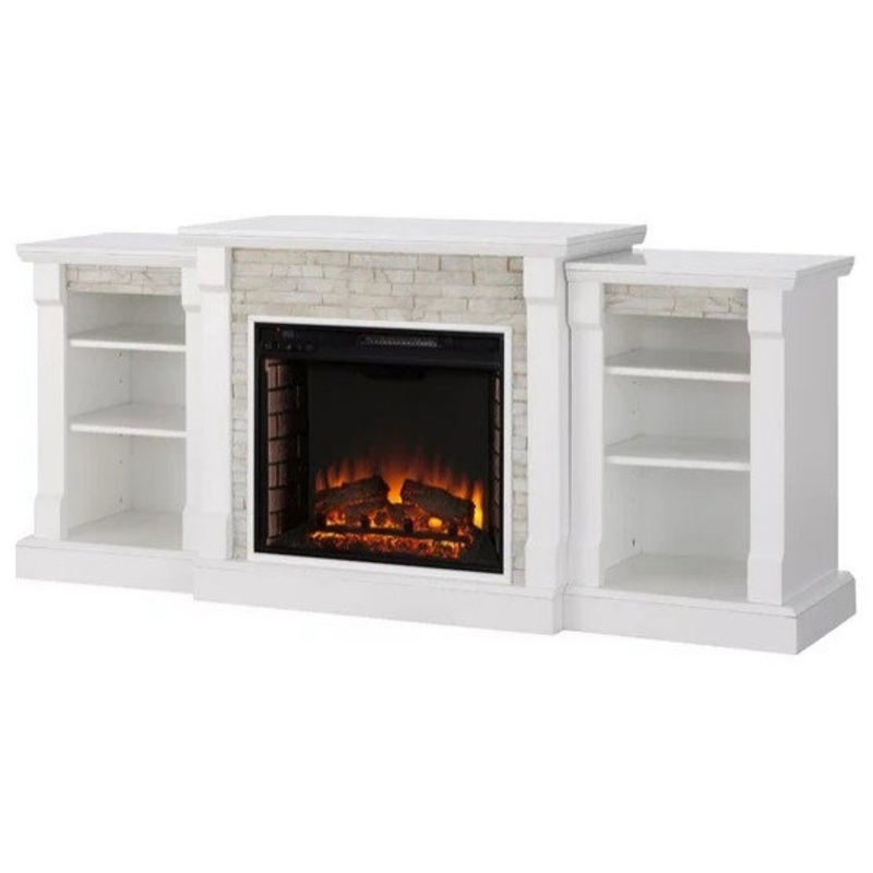 -Fireplace controlled with a remote -Capable of warming up to 400 sq. ft. -White finish -Dimensions: 18L x 71.75W x 32H in. -Flame effect can be operated with or without heat -Fireplace stays cool to the touch -2 bookcases on each sideProduct ID201516631Ma