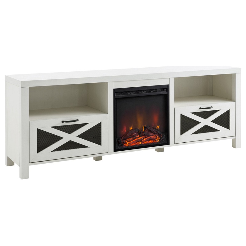 -The fireplace insert warms up any room of the house with its faux flames and heating feature. -Two lower drop-down doors with metal mesh provide closed storage cubbies. -Two open-storage shelves are perfect for displaying family photos or travel souvenirs