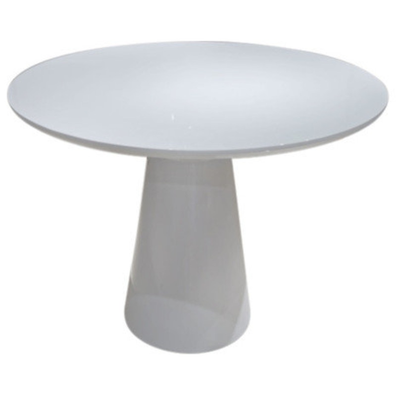This simple and elegant 36-inch round white lacquer top dining table is a mid-century-inspired look. The pedestal is crafted from one piece of black powder-coated base. Plus, the pedestal maximizes seating and frees up leg space, especially important in sm