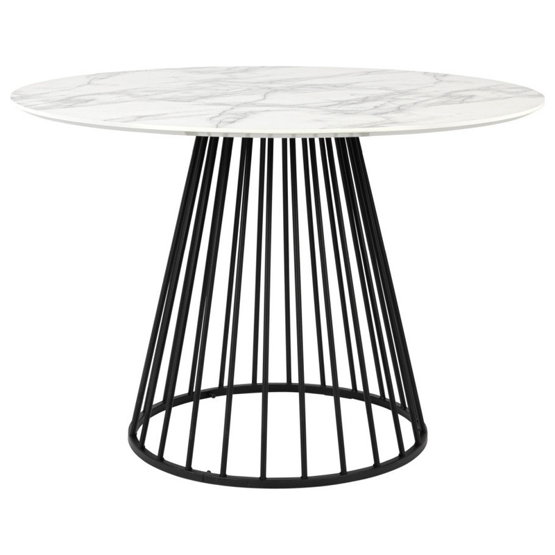 A modern coffee table with a white marble top and inverted cone steel base. Floris by DF adds a subtle visual charm that complements almost any interior scheme.