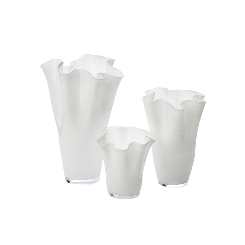 Abigails Ruffle Glass Vases make flower arranging so easy. The flowers seem to just arrange themselves. Three sizes are offered in these pristine white glass containers. Made in Portugal. Medium size