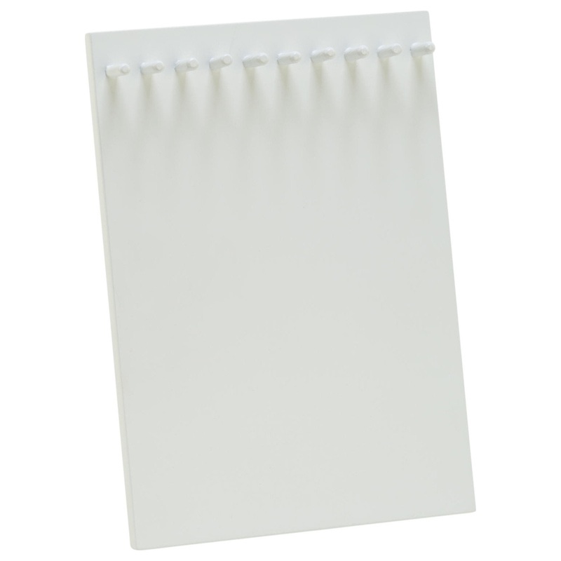 Clean, White painted jewelry displays features 10 - 3/4" long pegs, 3/8" dia. for hanging jewelry. Easel back base detaches for flat storage. This small piece is 10" high and perfect for delicate necklaces. -Bright White painted finish. -Smallest size for
