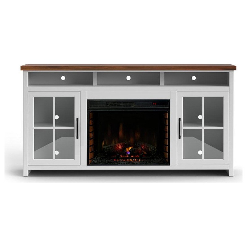 This 73 in. no assembly required Fireplace TV stand will hold up to a 80 in. TV and features 28 in. fireplace insert that heats up to 400 sq ft. In addition this Fireplace TV stand has two glass doors that has two fixed shelves and three top shelves to hold gaming consoles, audio and video equipment. Then just to put the final touches on this farmhouse TV stand we added cable management holes, Forged Iron hardware and had it made in our US factory.