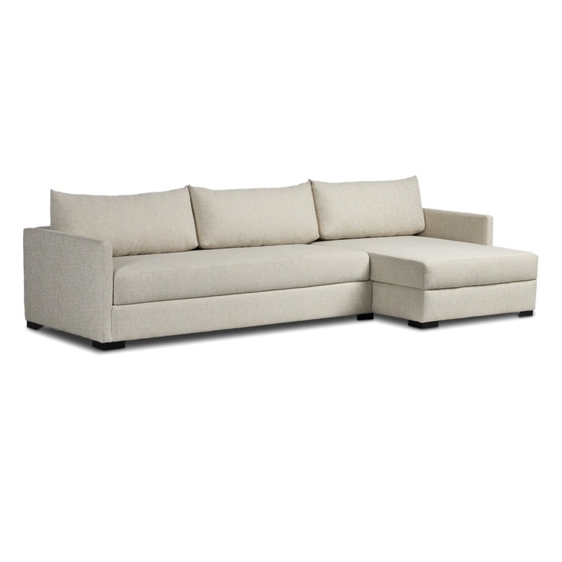 A simple, stylish silhouette redefines the classic sofa bed, now as a sectional. With knife-edge pillows and high-performance upholstery, the sleeper mechanism remains discreetly concealed, allowing for an easy one-step pullout. When unfolded, the sectional cushions form a comfortable bed, perfect for overnight guests or cozy movie nights?no extra mattress necessary. Plus, the addition of a storage chaise offers ample space for blankets and pillows, easily accessed by lifting the front of the chaise cushion. Comfort, storage, and style all in one. Performance fabrics are specially created to withstand spills, stains, high traffic and wear, ensuring long-term comfort and unmatched durability.