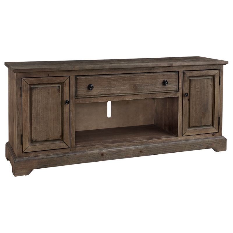 Indulge your senses with this textural wood finish and shapely arches that will transform any room into a masterpiece. This console has just the right amount of sass but still classy and graceful. Features two framed doors with routed moldings with adjustable shelving behind. Hardware consists of a bronze finished dimensional knob with rosette backplate. Features a routed center drawer and one stationary open shelf underneath. Maximum Recommended TV size is 80″.