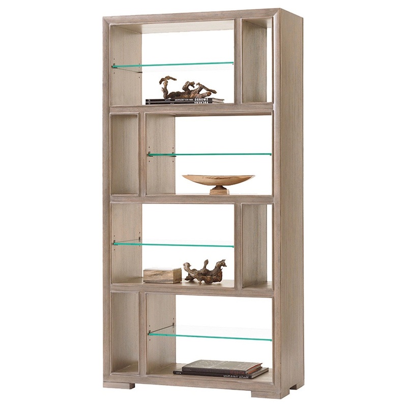 The versatile open bookcase makes a strong design statement as a single unit or bunched in a grouping. The piece is finished on all sides, allowing it to float as a room divider. The vertical partitions are stationary and the four glass shelves are adjustable.
