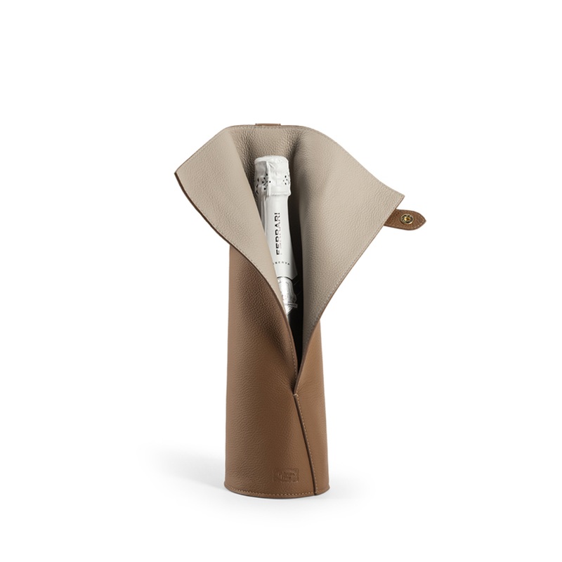 A bottle rack bag entirely in leather celebrates the oldest of beverages: wine. With a rigid structure, Wine Bag features a single compartment to easily and safely hold and transport bottles.