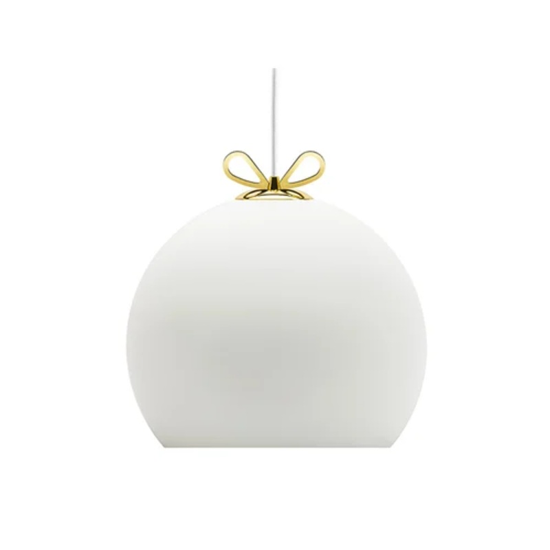The humble wing nut, which is normally used as a purely functional component in engineering and assembly, is elevated and celebrated as a decidedly decorative feature. Made ‘precious’ by finishing in polished brass, and given pride of place, the wing nut now resembles a golden bow on top of the beautifully simple shade. The sophisticated construction of the frosted white glass shade is designed to diffuse the light evenly and create the perfect warm and well lit atmosphere.