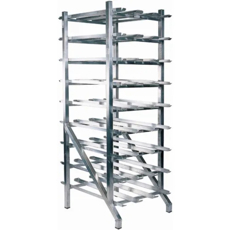 Organizes stock and maximizes available space. This rack has a self-feeding feature keeps stock rotated. The vertical uprights and cross braces are constructed of 1-1/2" aluminum tubing. NSF listed.