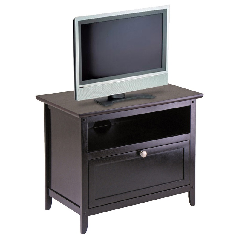 Zara line of TV cabinets, a 25 wood stand with one open storage shelf and one storage shelf with pull down door. Contemporary styling is accented with brushed aluminum knob and Espresso finish.