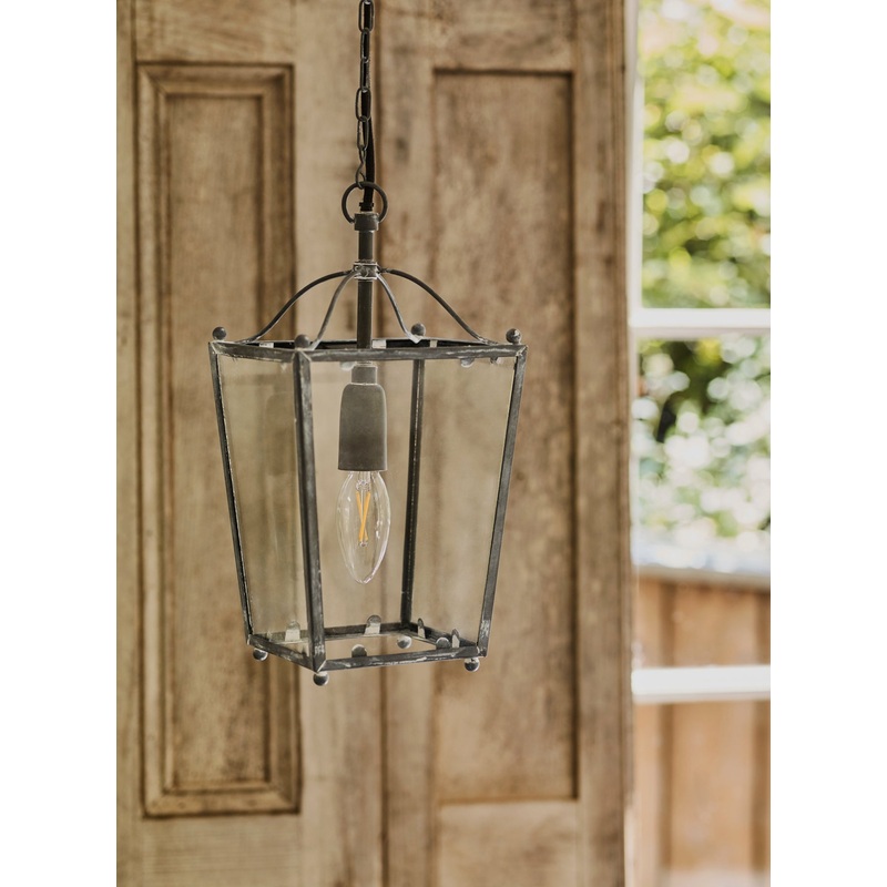 - A romantic French-inspired glass lantern- Crafted from galvanised iron with an aged finish- Delicate arms and slim chain hanging- Small orbs on each corner- Emulates the comforting sight of a traditional candle lantern