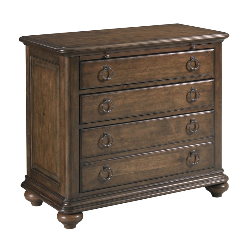 The Witham Bachelor’s Chest includes three drawers, a night light and electric outlet on the back of the case. It also includes a laminate pull out tray above the top drawer that provides a place for a cold or hot drink.