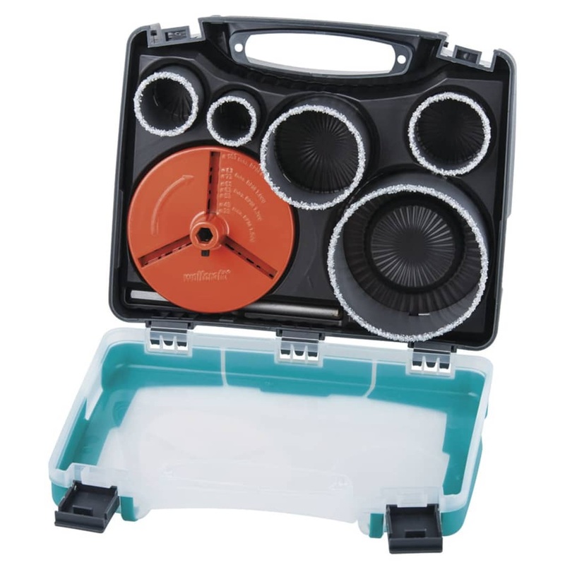 This wolfcraft hole saw set is designed for drilling holes in different materials, such as brick walls, bricks, breeze blocks, plasterboard, tile, etc. It is ideal for installing sockets, distribution boxes, or tubes. With 5 quick-change, tungsten-carbide-