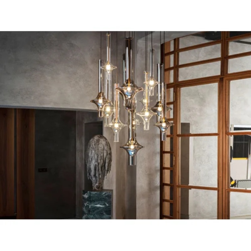 This exquisite suspension lamp is crafted from borosilicate glass, which ensures a radiant and luminous quality that enchants any setting. The design features a harmonious combination of various elements, each differing in size, finish, and height, creating a dynamic visual centerpiece. The lamp is available in transparent or smoked finishes, offering versatility to suit diverse interior styles. Its thoughtfully arranged structure makes it an ideal choice for illuminating spacious areas such as living rooms or dining areas, where light becomes an integral part of the dcor.