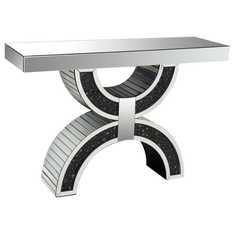 A geometric style base and clear acrylic panels filled with black faux crystals ensures that this Console will be the crowning jewel of your home. The table is constructed from durable Composite Wood materials and it is fully lined with beveled mirrors tha