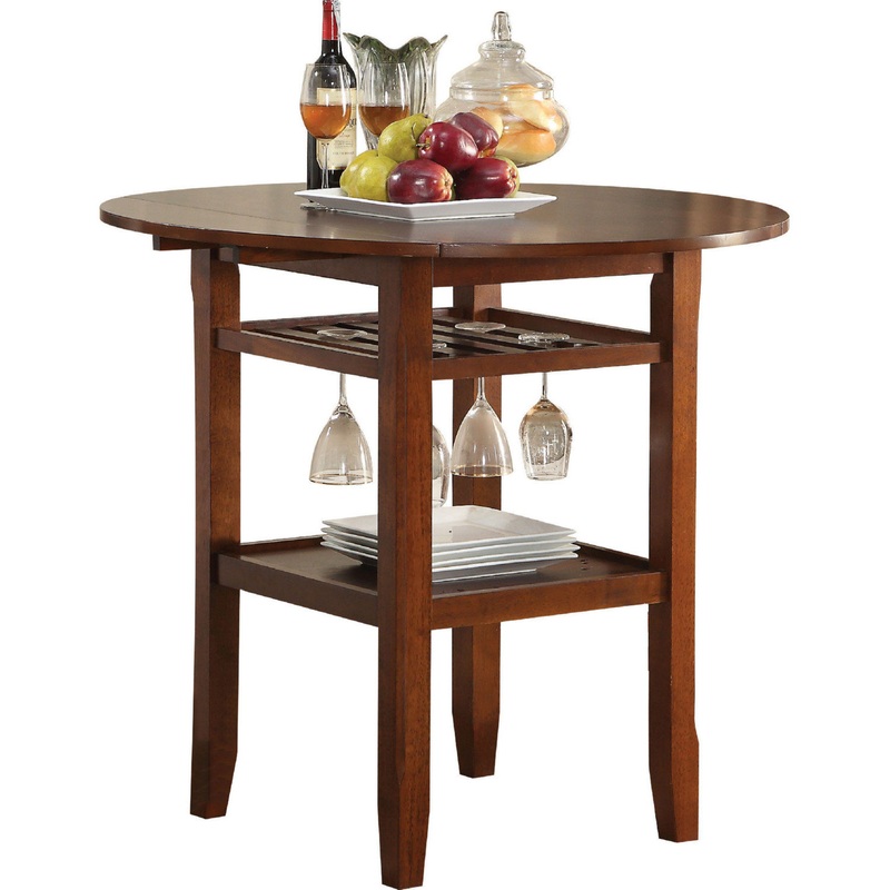The table creates functional and versatility perfect for any small dining space. This casual set features a round leg table with 2 drop leaves, a wine glass rack and a bottom shelf. Handsomely crafted in warm Cherry Finish, composed from wood and selected veneers.