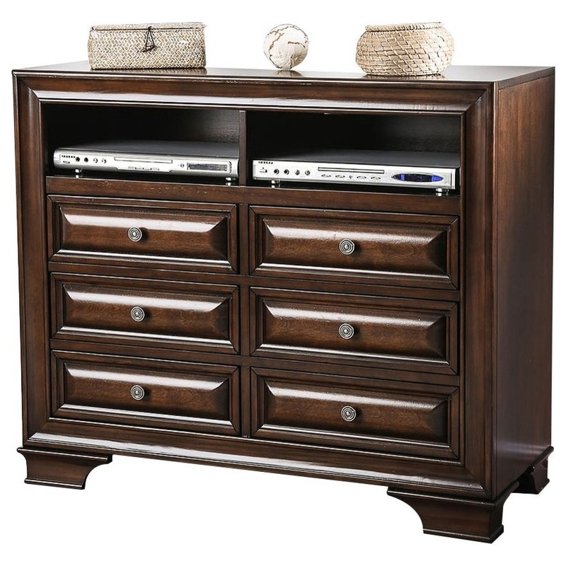 Wooden Media Chest With Six Drawer And Two Open Shelf In Cherry BrownThis transitional style wood media chest comes with open shelf space and glass door cabinet which offer lots of storage space to use for your entertainment devices such as Setup Box, Vide