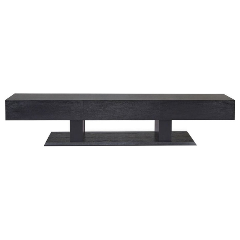 Inspired by a sleek transnational lifestyle, this TV stand is designed to be an essential piece in any living room area. It is wrapped in high-quality black veneer, ultimate elegance is presented with functionality. Featuring three drawers and an open comp
