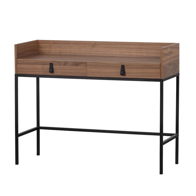 The Bookazine Desk in walnut finish is a sleek table with straight black metal legs, equipped with two drawers ideal for storage. The drawers are paired with leather handles giving it an overall masculine appeal. Dutch design and made in Holland.