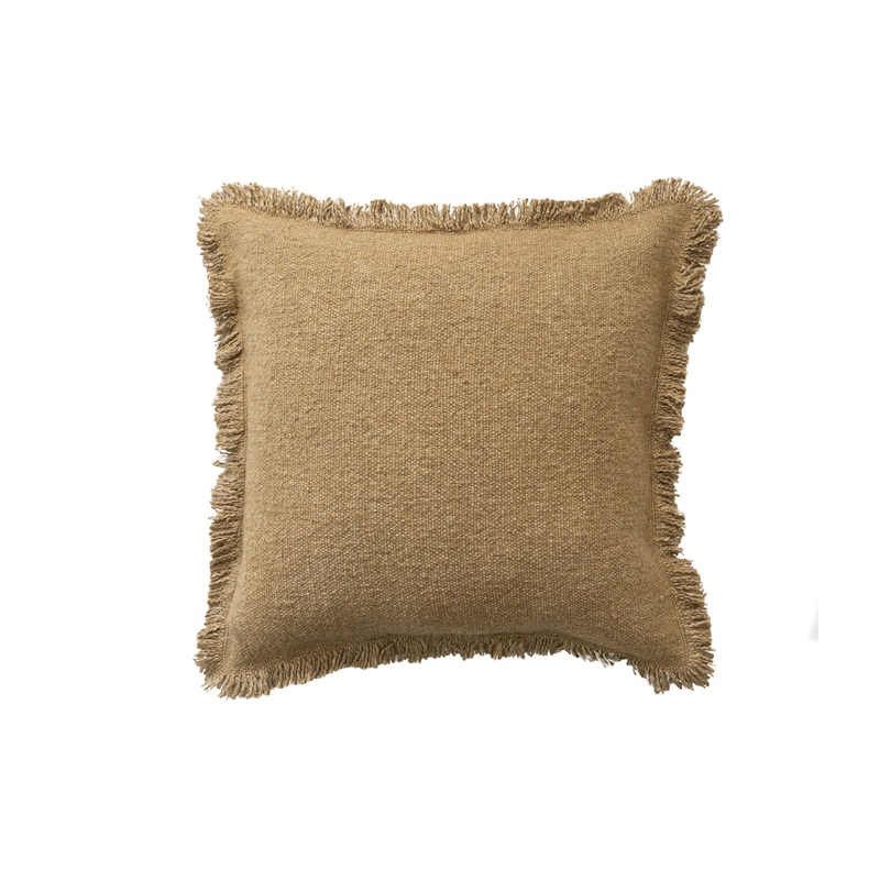 Olive green woven cotton blend pillow cover with fringe; Cover: 65% Cotton, 20% Rayon, 15% Linen; 18″ L x 18″ W