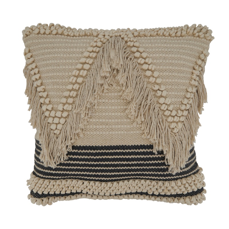 Bring a textured, natural look and feel to your home decor with a fiercely modern and bold design. The Woven Fringe Throw Pillow design plays with multiple textures and geometric shapes to add beautiful dimension to your sofa, armchair or any interior spac