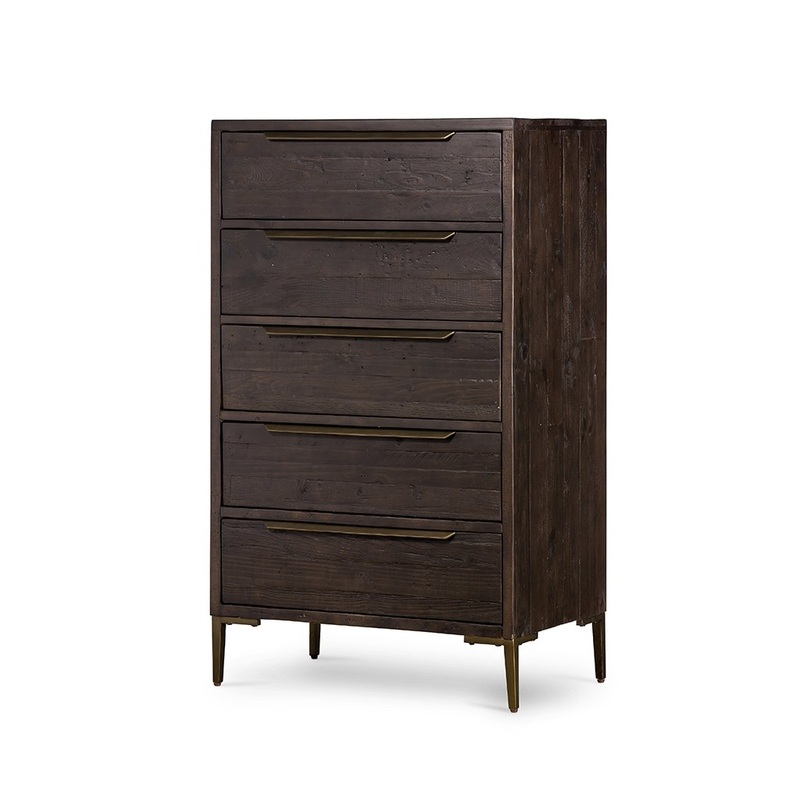 Mixed reclaimed woods take on a deep carbon tone, letting natural graining emit its innately rich character. Slim legs and flat, antique brass-finished iron hardware place a fresh spin on a streamlined form. Five drawers for ample bedroom storage.