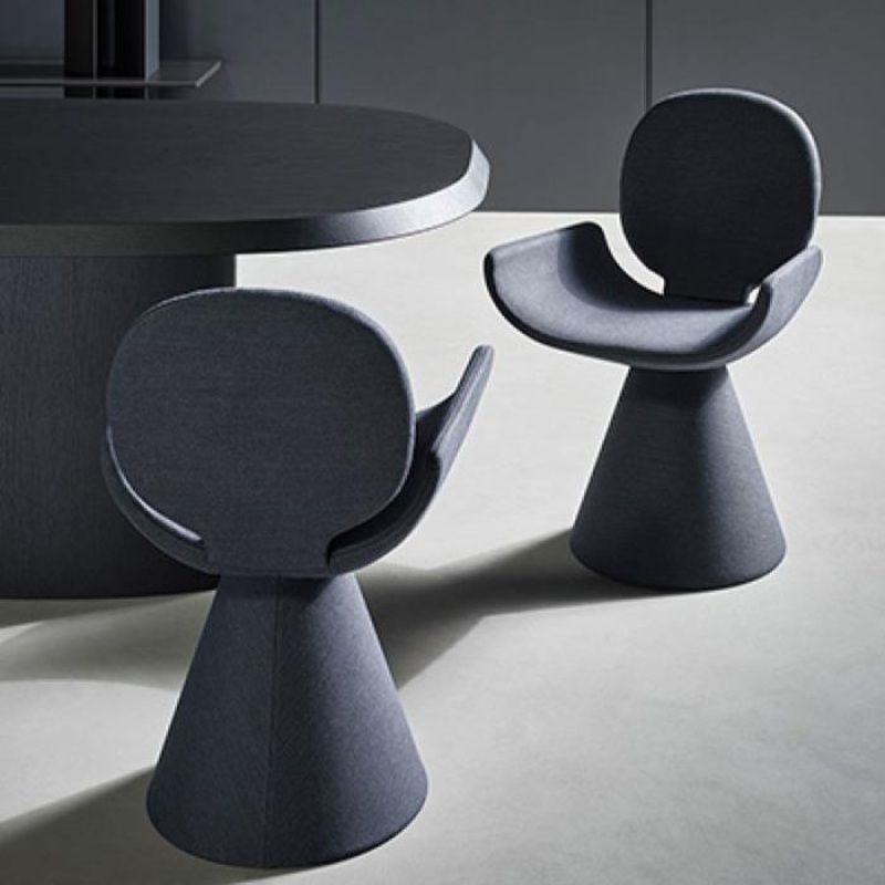 Seen from behind, the profile of the Youpi chair calls to mind the image of a stylized human figure, ready to welcome you in a comfortable embrace. Designed by Fabrice Berrux, what strikes the observer about the Youpi chair is its original shape, which adds style and a sense of lightness to any space. It consists of a series of different forms that combine to create a harmonious ensemble thanks to the fabric or leather upholstery that completely covers it: the circular backrest flows into the large seat and the whole is supported by a flared conical base. The Youpi unique design chair is also available in a version with four metal legs.