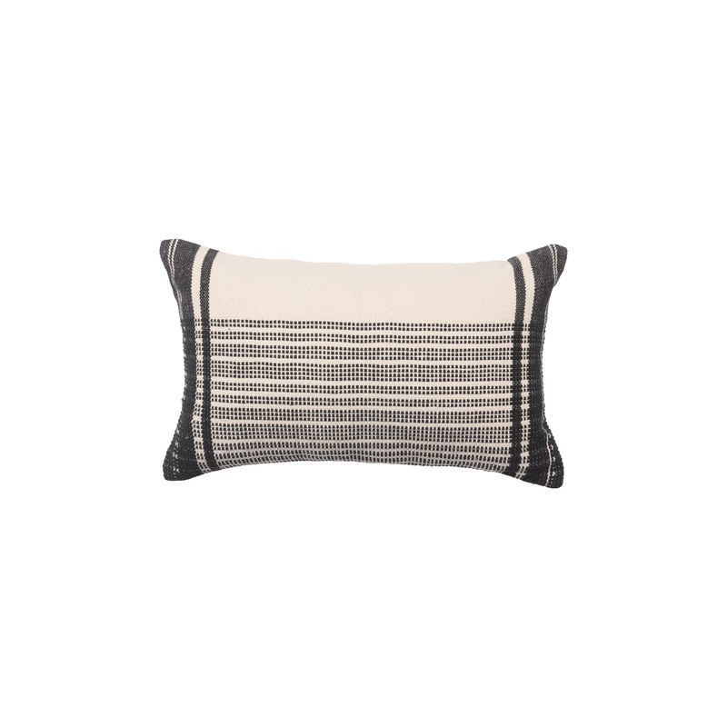 The Renata pillow collection features modern designs, neutral colorways, and a rich texture that grounds any space. The Zita lumbar pillow displays a striped pattern in neutral hues of black and cream for a modern feel. This indoor accent piece thrives on