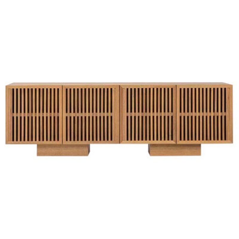 Beautiful slatted doors adorn the Zither Media Cabinet, opening to reveal spacious storage and clever wire management solutions for your media center. The slender latticework is supported by wider feet for a thoroughly modern look.Inspired by the graceful