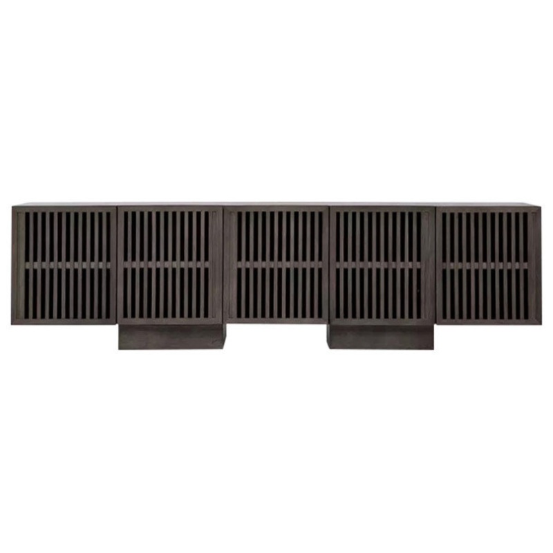 Beautiful slatted doors adorn the Zither Media Cabinet, opening to reveal spacious storage and clever wire management solutions for your media center. The slender latticework is supported by wider feet for a thoroughly modern look.Inspired by the graceful